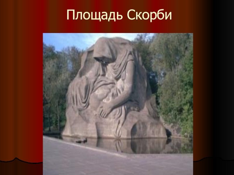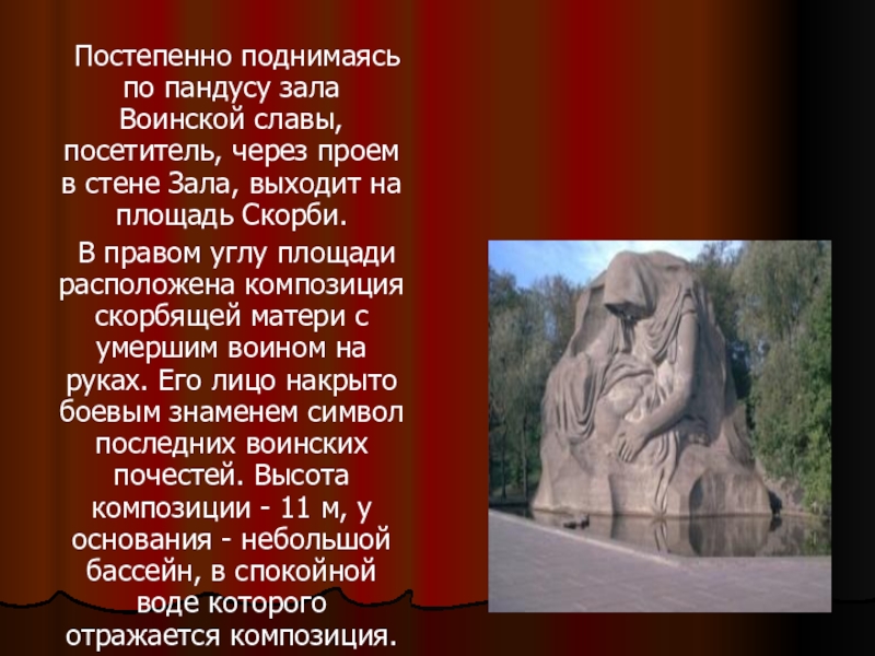 В правом углу площади расположена композиция скорбящей матери с умершим воином на руках. Его лицо накрыто боевым знаменем символ последних воинских почестей. Высота композиции - 11 м, у основания - небольшой бассейн, в спокойной воде которого отражается композиция.