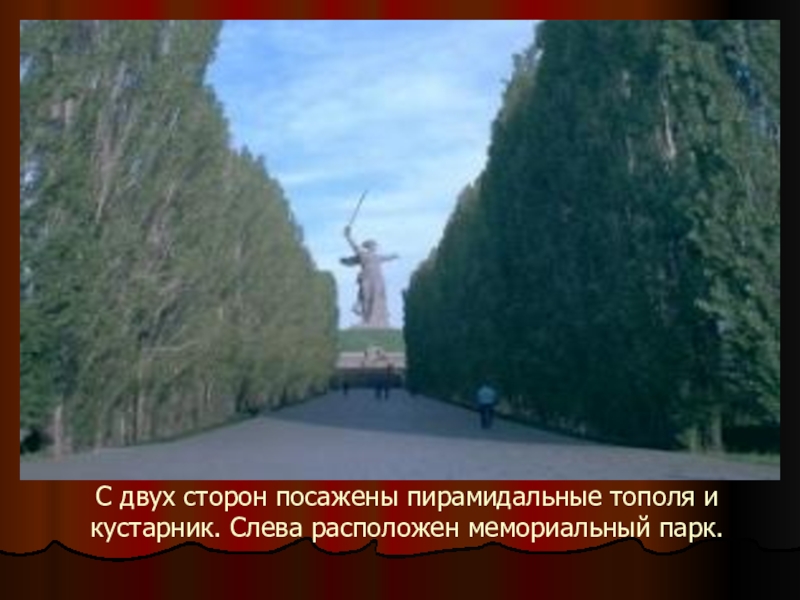 С двух сторон посажены пирамидальные тополя и кустарник. Слева расположен мемориальный