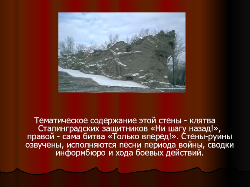 Тематическое содержание этой стены - клятва Сталинградских защитников «Ни шагу назад!»,