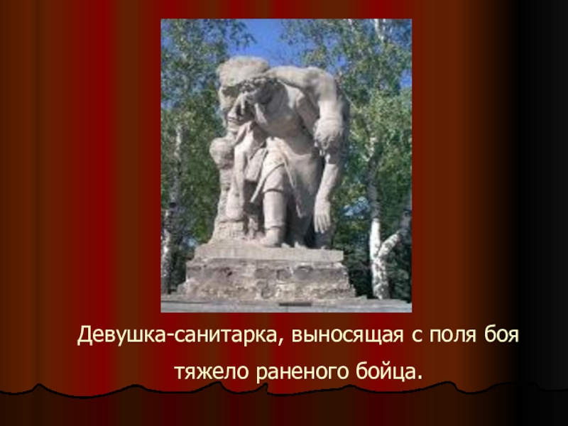 Слайд 24Девушка-санитарка, выносящая с поля боя тяжело раненого бойца.