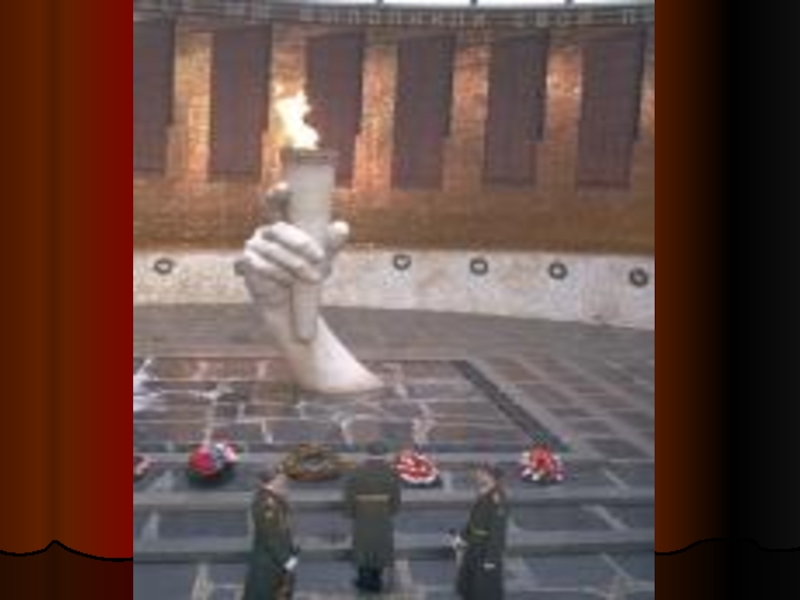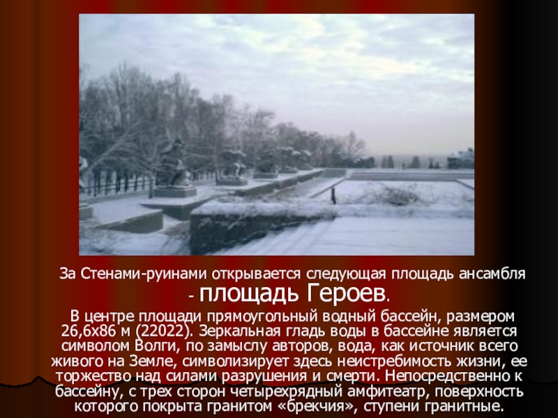 Слайд 21 За Стенами-руинами открывается следующая площадь ансамбля - площадь Героев.