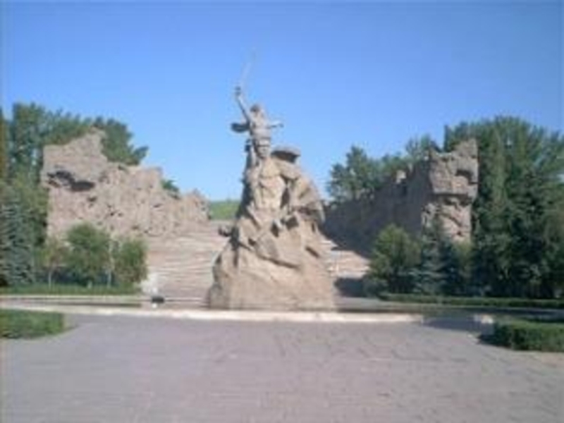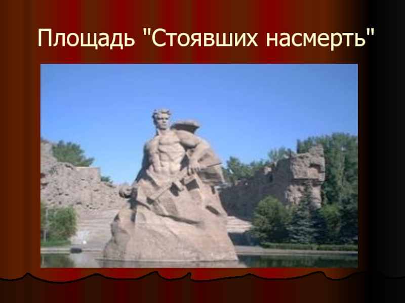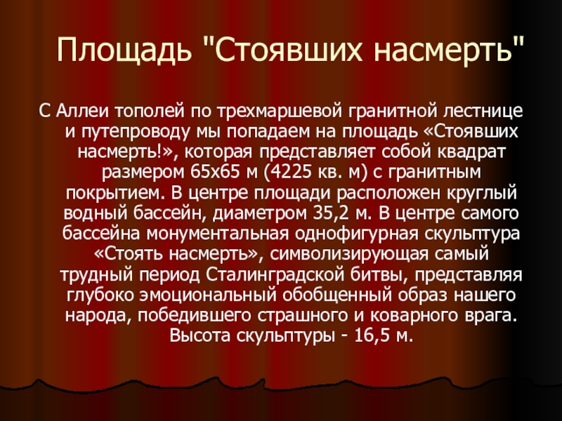 мы попадаем на площадь «Стоявших насмерть!», которая представляет собой квадрат размером 65х65 м (4225 кв. м) с гранитным покрытием. В центре площади расположен круглый водный бассейн, диаметром 35,2 м. В центре самого бассейна монументальная однофигурная скульптура «Стоять насмерть», символизирующая самый трудный период Сталинградской битвы, представляя глубоко эмоциональный обобщенный образ нашего народа, победившего страшного и коварного врага. Высота скульптуры - 16,5 м.