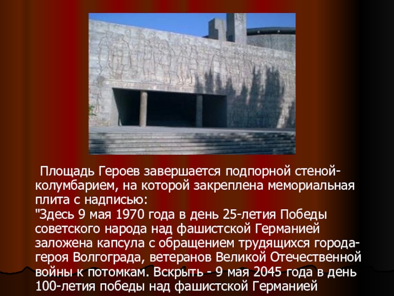 "Здесь 9 мая 1970 года в день 25-летия Победы советского народа над фашистской Германией заложена капсула с обращением трудящихся города-героя Волгограда, ветеранов Великой Отечественной войны к потомкам. Вскрыть - 9 мая 2045 года в день 100-летия победы над фашистской Германией
