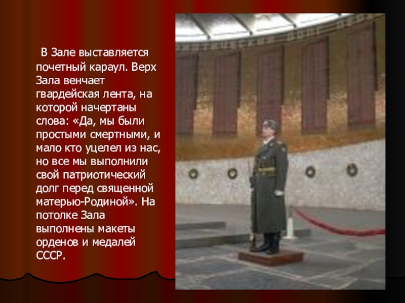которой начертаны слова: «Да, мы были простыми смертными, и мало кто уцелел из нас, но все мы выполнили свой патриотический долг перед священной матерью-Родиной». На потолке Зала выполнены макеты орденов и медалей СССР.