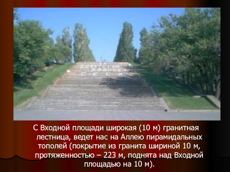 нас на Аллею пирамидальных тополей (покрытие из гранита шириной 10 м, протяженностью – 223 м, поднята над Входной площадью на 10 м).