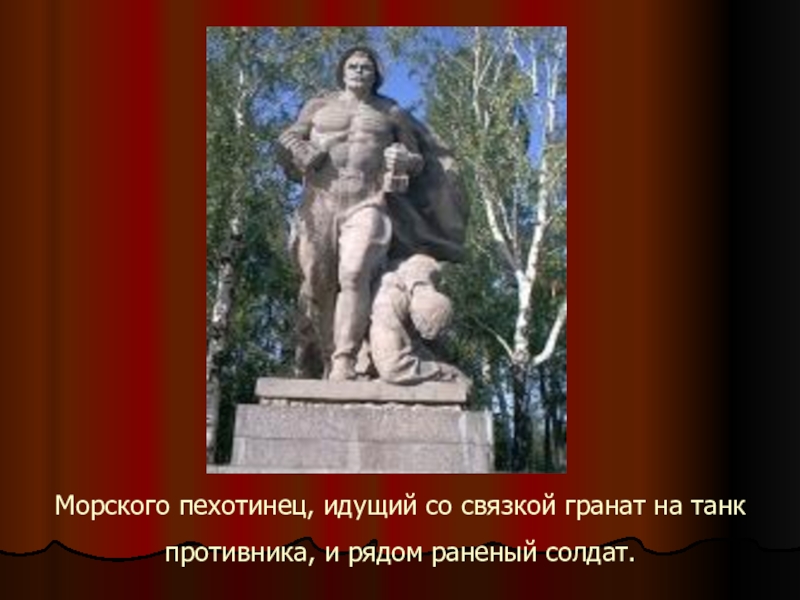 Слайд 25Морского пехотинец, идущий со связкой гранат на танк противника, и рядом