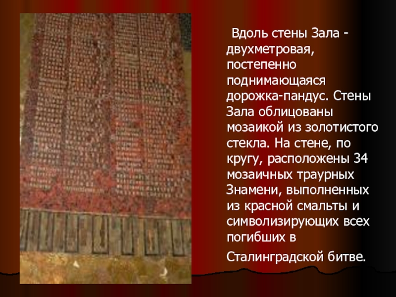 мозаикой из золотистого стекла. На стене, по кругу, расположены 34 мозаичных траурных Знамени, выполненных из красной смальты и символизирующих всех погибших в Сталинградской битве.