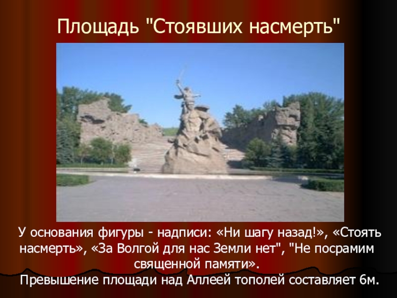 У основания фигуры - надписи: «Ни шагу назад!»,