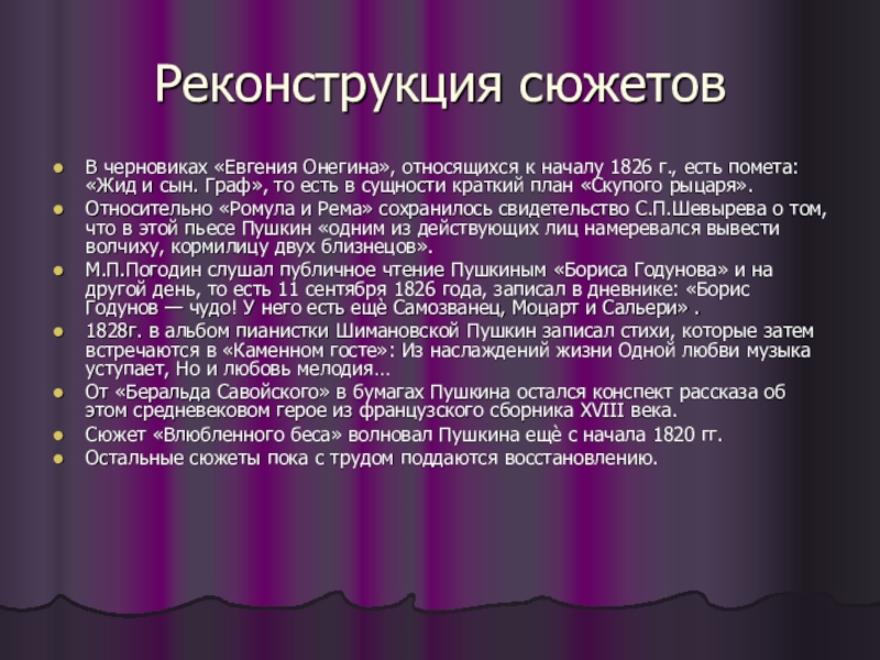 1828г. в альбом пианистки Шимановской Пушкин записал стихи, которые затем встречаются в «Каменном госте»: Из наслаждений жизни Одной любви музыка уступает, Но и любовь мелодия…