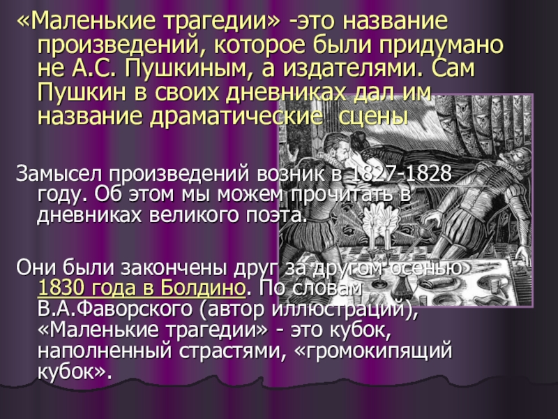 Они были закончены друг за другом осенью 1830 года в Болдино. По словам В.А.Фаворского (автор иллюстраций), «Маленькие трагедии» - это кубок, наполненный страстями, «громокипящий кубок».