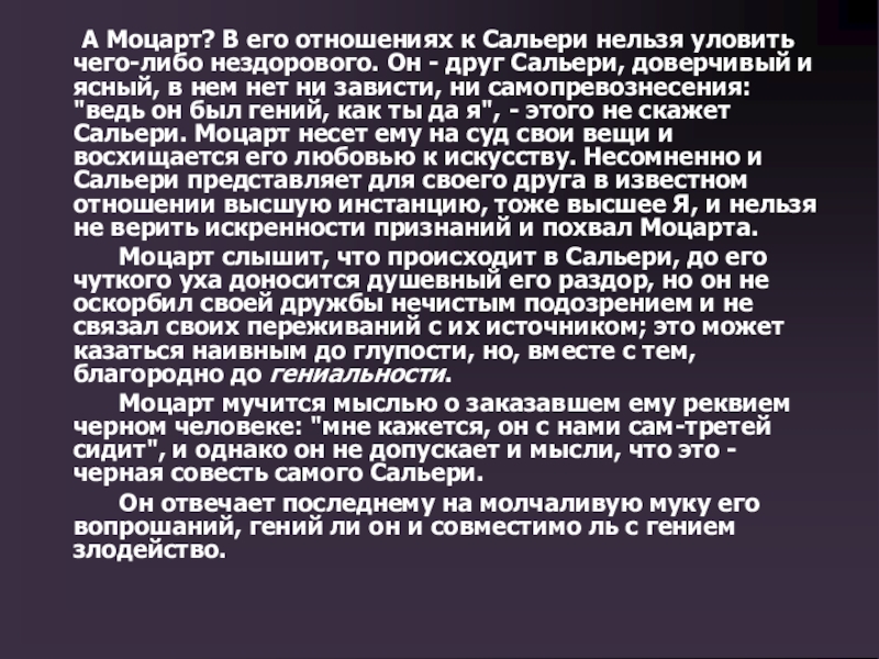 Моцарт слышит, что происходит в Сальери, до его чуткого уха доносится душевный его раздор, но он не оскорбил своей дружбы нечистым подозрением и не связал своих переживаний с их источником; это может казаться наивным до глупости, но, вместе с тем, благородно до гениальности.