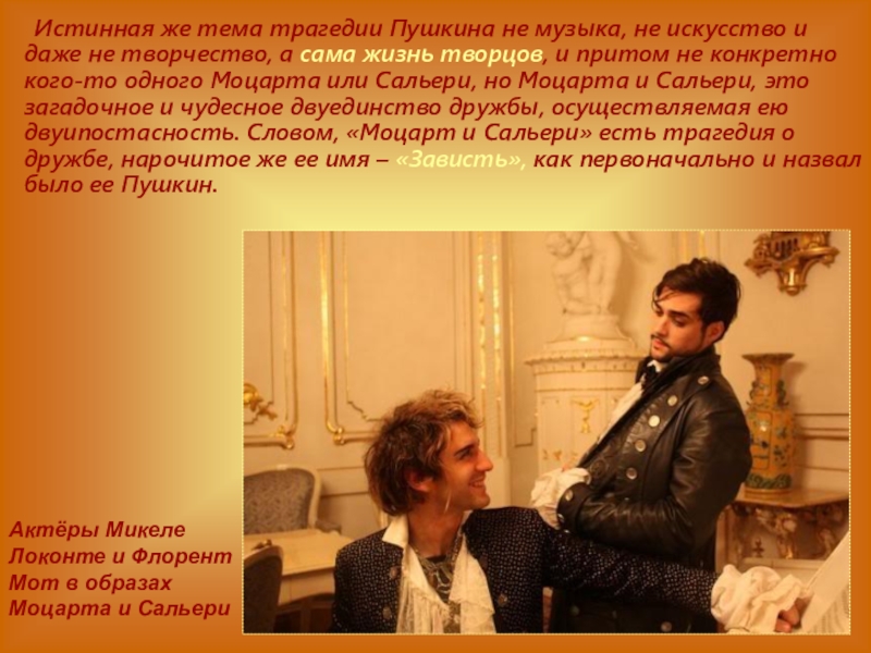 искусство и даже не творчество, а сама жизнь творцов, и притом не конкретно кого-то одного Моцарта или Сальери, но Моцарта и Сальери, это загадочное и чудесное двуединство дружбы, осуществляемая ею двуипостасность. Словом, «Моцарт и Сальери» есть трагедия о дружбе, нарочитое же ее имя – «Зависть», как первоначально и назвал было ее Пушкин.