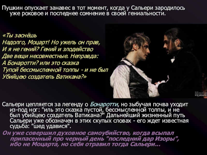 Слайд 16Пушкин опускает занавес в тот момент, когда у Сальери зародилось уже