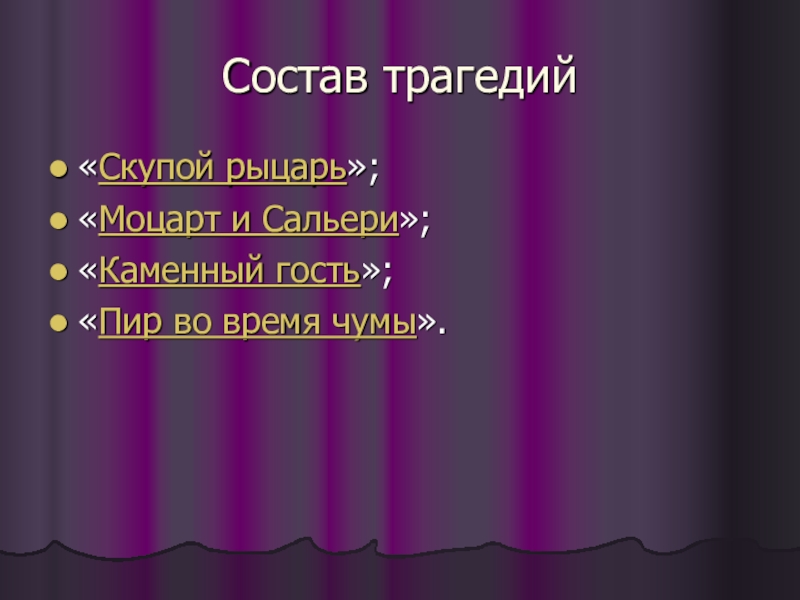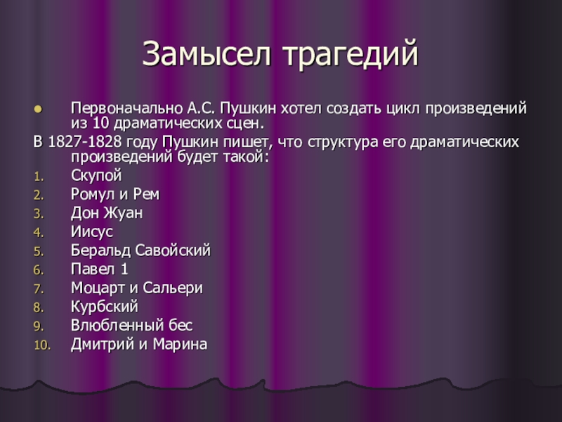 Слайд 10Мы решили взять и рассмотеть одну из «Трагедий» Пушкина, а именно