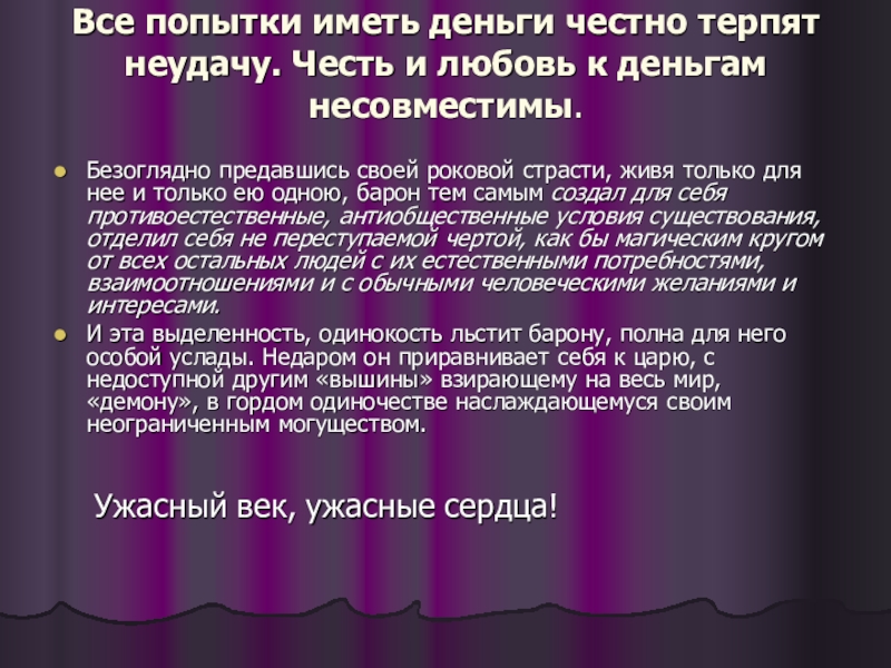 Безоглядно предавшись своей роковой страсти, живя только для нее и только ею одною, барон тем самым создал для себя противоестественные, антиобщественные условия существования, отделил себя не переступаемой чертой, как бы магическим кругом от всех остальных людей с их естественными потребностями, взаимоотношениями и с обычными человеческими желаниями и интересами.