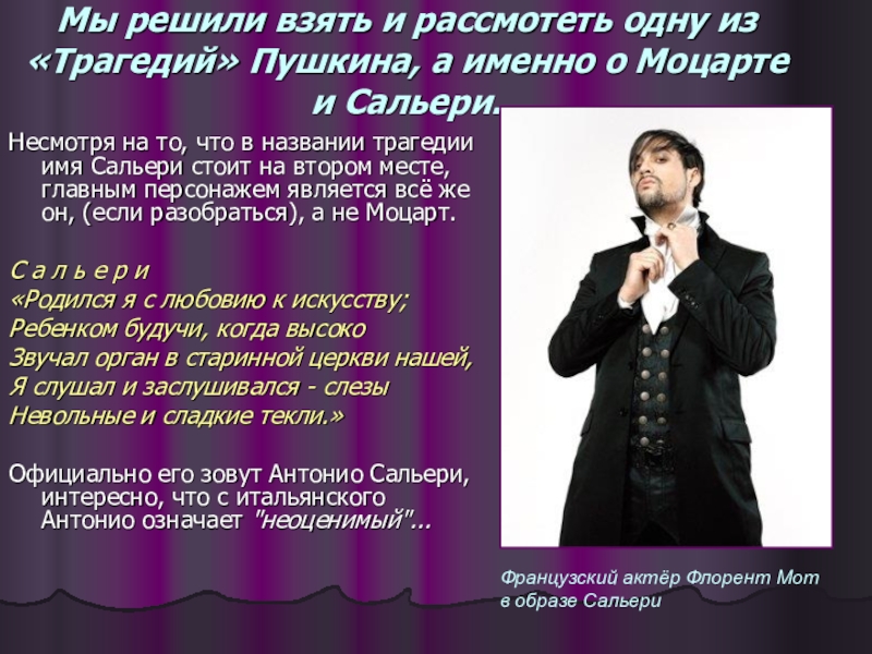 Несмотря на то, что в названии трагедии имя Сальери стоит на втором месте, главным персонажем является всё же он, (если разобраться), а не Моцарт.