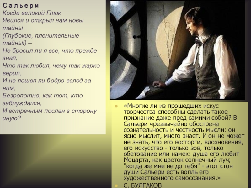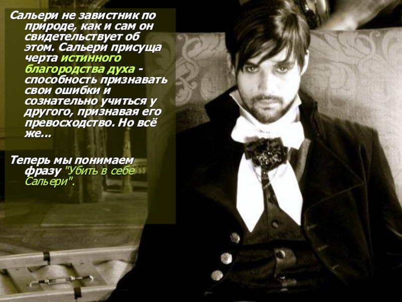 Слайд 13Сальери не завистник по природе, как и сам он свидетельствует об
