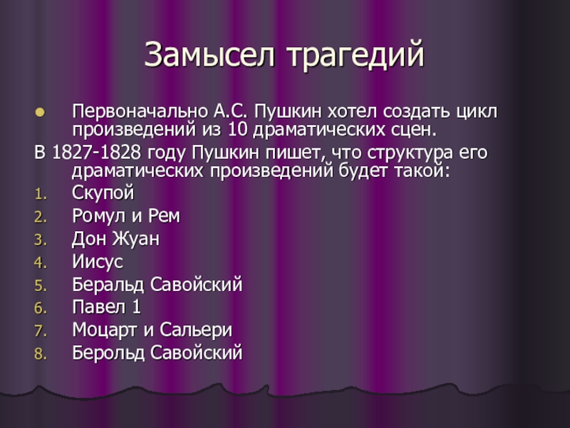Первоначально А.С. Пушкин хотел создать цикл произведений из 10 драматических
