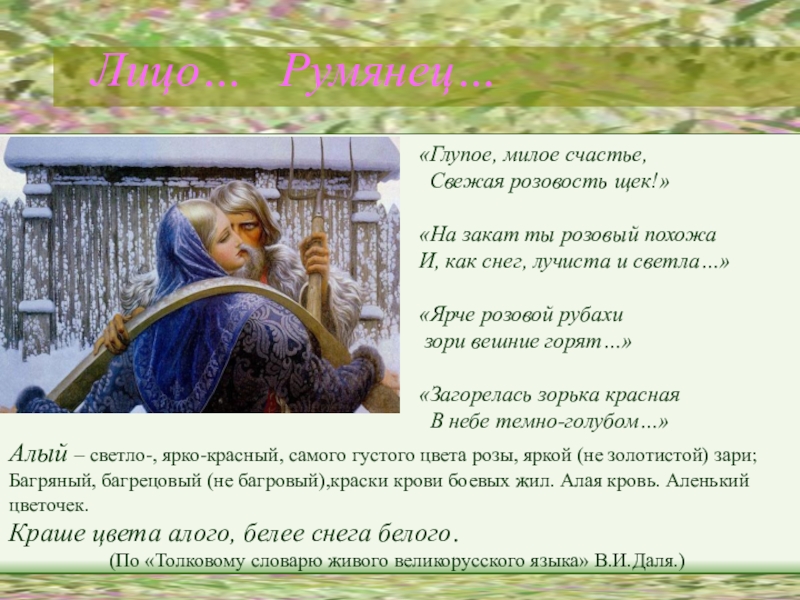 Алый – светло-, ярко-красный, самого густого цвета розы, яркой (не золотистой) зари;