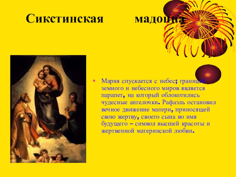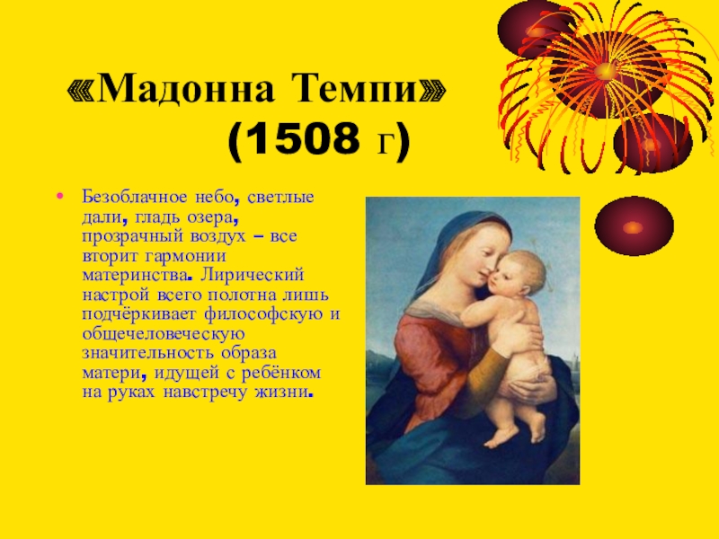Безоблачное небо, светлые дали, гладь озера, прозрачный воздух – все вторит гармонии материнства. Лирический настрой всего полотна лишь подчёркивает философскую и общечеловеческую значительность образа матери, идущей с ребёнком на руках навстречу жизни.