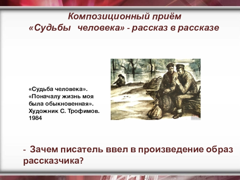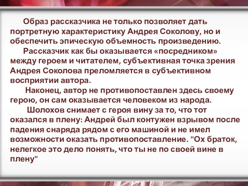 Рассказ «Судьба человека» - это, в сущности, эпос, только сжатый до размеров рассказа, то есть до самого существенного, до самого важного – до единой человеческой судьбы, вобравшей в себя, однако, суть и смысл великого подвига всего народа