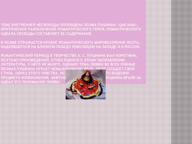 Теме внутренней несвободы посвящена поэма Пушкина «Цыганы». Критическое разоблачение романтического героя,