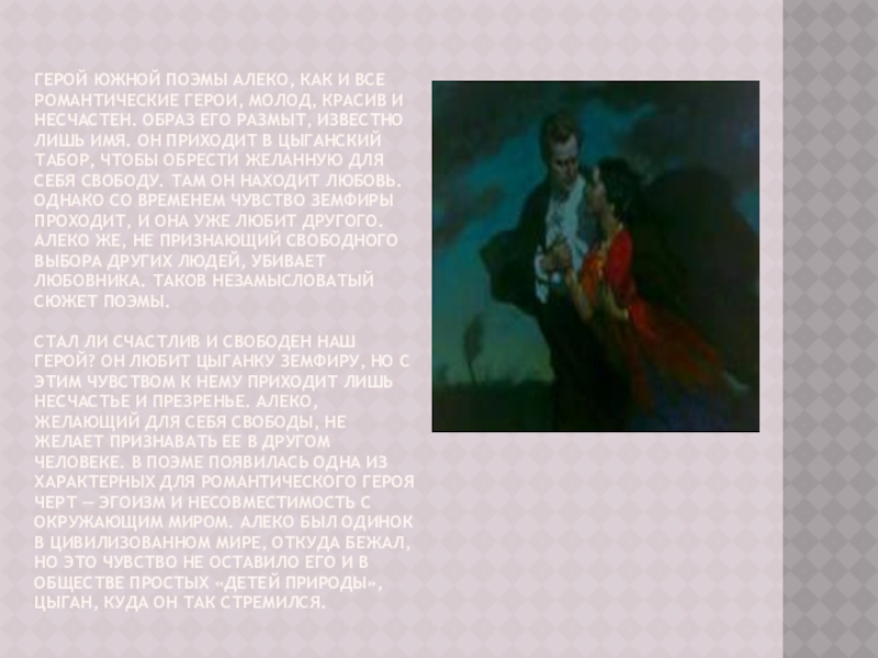 Слайд 4Герой южной поэмы Алеко, как и все романтические герои, молод, красив