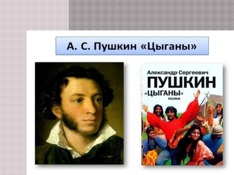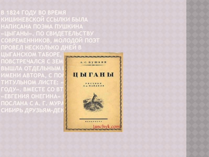 «Цыганы». По свидетельству современников, молодой поэт провел несколько дней в цыганском таборе, где повстречался с Земфирой. Поэма вышла отдельным изданием, без имени автора, с пометкой на титульном листе: «Писано в 1824 году». Вместе со второй главой «Евгения Онегина» книга была послана с А. Г. Муравьевой в Сибирь друзьям-декабристам.