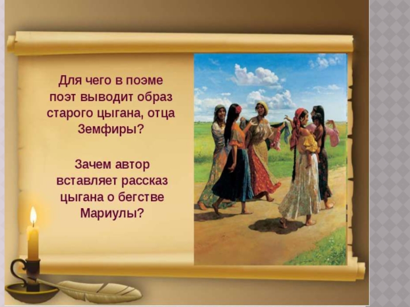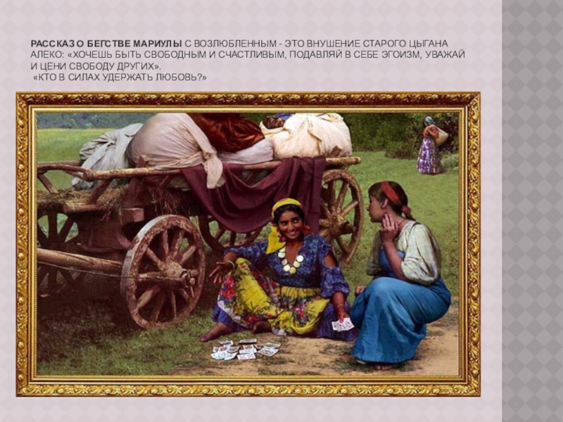 Слайд 12Рассказ о бегстве Мариулы с возлюбленным - это внушение старого цыгана Алеко: «Хочешь быть свободным и