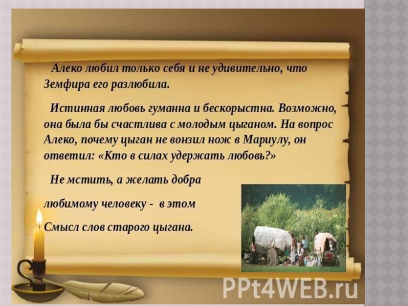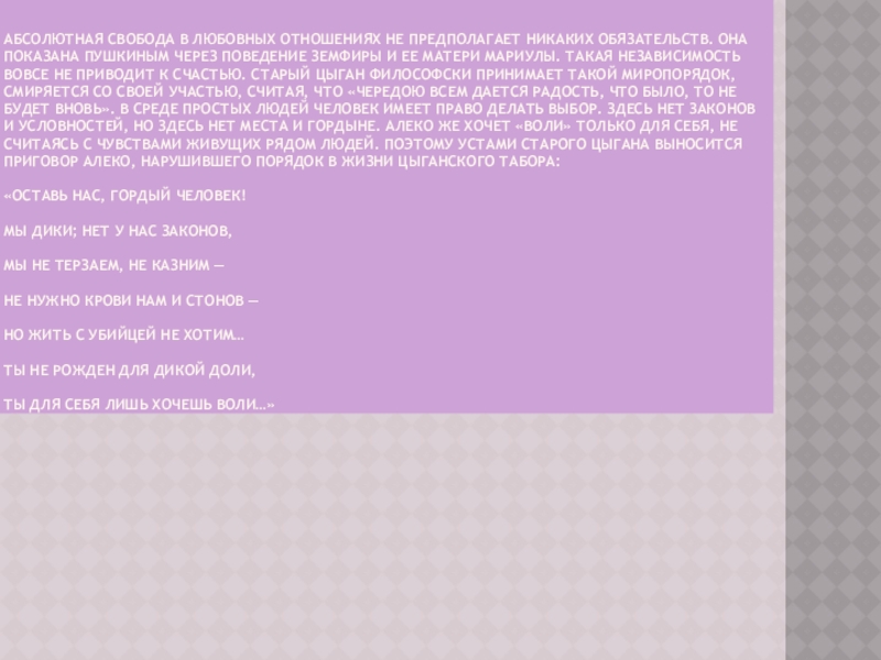 Пушкиным через поведение Земфиры и ее матери Мариулы. Такая независимость вовсе не приводит к счастью. Старый цыган философски принимает такой миропорядок, смиряется со своей участью, считая, что «чередою всем дается радость, что было, то не будет вновь». В среде простых людей человек имеет право делать выбор. Здесь нет законов и условностей, но здесь нет места и гордыне. Алеко же хочет «воли» только для себя, не считаясь с чувствами живущих рядом людей. Поэтому устами старого цыгана выносится приговор Алеко, нарушившего порядок в жизни цыганского табора: