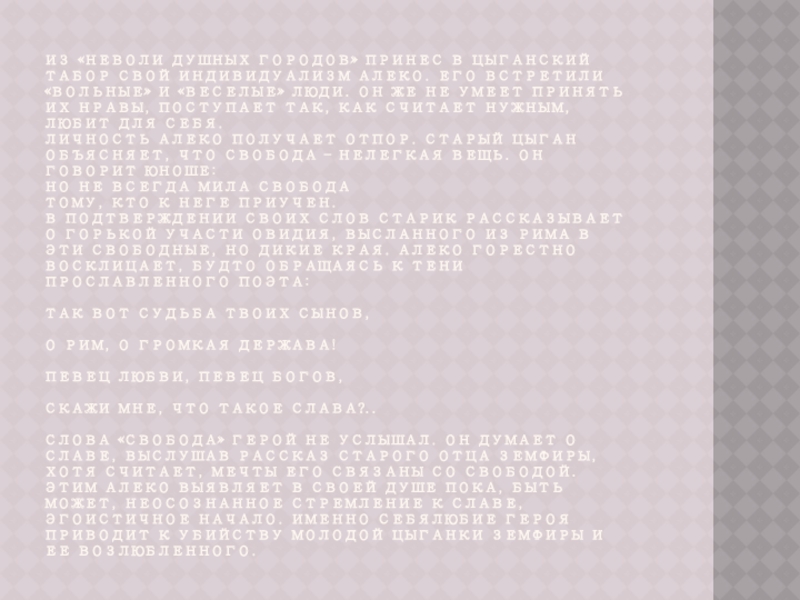 Слайд 5Из «неволи душных городов» принес в цыганский табор свой индивидуализм Алеко.