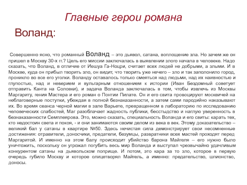 сатана, воплощение зла. Но зачем же он пришел в Москву 30-х гг.? Цель его миссии заключалась в выявлении злого начала в человеке. Надо сказать, что Воланд, в отличие от Иешуа Га-Ноцри, считает всех людей не добрыми, а злыми. И в Москве, куда он прибыл творить зло, он видит, что творить уже нечего – зло и так заполонило город, проникло во все его уголки. Воланду оставалось только смеяться над людьми, над их наивностью и глупостью, над и неверием и вульгарным отношением к истории (Иван Бездомный советует отправить Канта на Соловки), и задача Воланда заключалась в том, чтобы извлечь из Москвы Маргариту, гения Мастера и его роман о Понтии Пилате. Он и его свита провоцируют москвичей на неблаговерные поступки, убеждая в полной безнаказанности, а затем сами пародийно наказывают их. Во время сеанса черной магии в зале Варьете, превращенном в лабораторию по исследованию человеческих слабостей, Маг разоблачает жадность публики, бесстыдство и наглую уверенность в безнаказанности Семплеярова. Это, можно сказать, специальность Воланда и его свиты: карать тех, кто недостоин света и покоя, - и они занимаются своим делом из века в век. Этому доказательство – великий бал у сатаны в квартире №50. Здесь нечистая сила демонстрирует свои несомненные достижения: отравители, доносчики, предатели, безумцы, развратники всех мастей проходят перед Маргаритой. И именно на этом балу происходит убийство барона Майгеля – его нужно было уничтожить, поскольку он угрожал погубить весь мир Воланда и выступал чрезвычайно удачливым конкурентом сатаны на дьявольском поприще. И потом, это кара за то зло, которое в первую очередь губило Москву и которое олицетворял Майгель, а именно: предательство, шпионство, доносы.