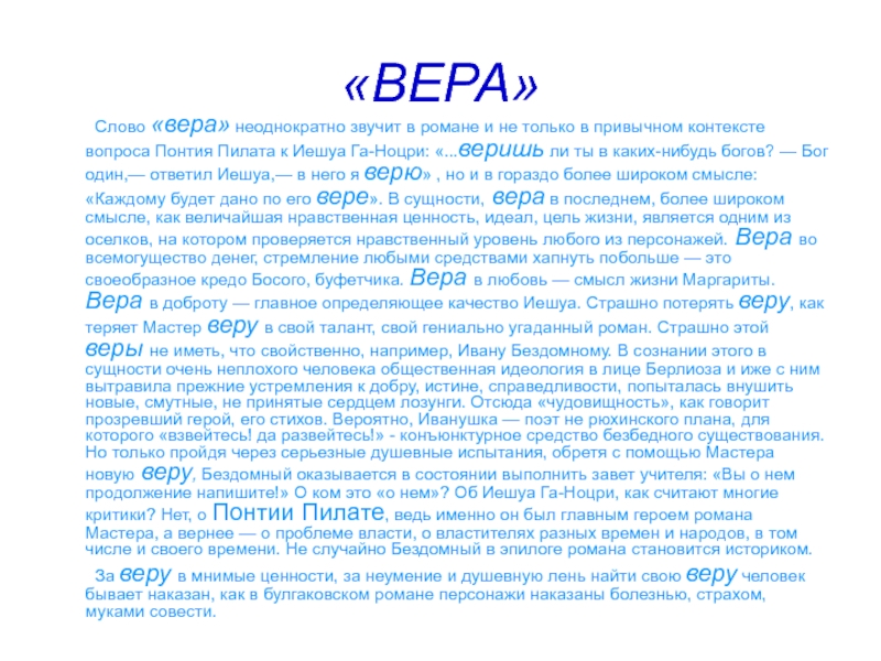 и не только в привычном контексте вопроса Понтия Пилата к Иешуа Га-Ноцри: «...веришь ли ты в каких-нибудь богов? — Бог один,— ответил Иешуа,— в него я верю» , но и в гораздо более широком смысле: «Каждому будет дано по его вере». В сущности, вера в последнем, более широком смысле, как величайшая нравственная ценность, идеал, цель жизни, является одним из оселков, на котором проверяется нравственный уровень любого из персонажей. Вера во всемогущество денег, стремление любыми средствами хапнуть побольше — это своеобразное кредо Босого, буфетчика. Вера в любовь — смысл жизни Маргариты. Вера в доброту — главное определяющее качество Иешуа. Страшно потерять веру, как теряет Мастер веру в свой талант, свой гениально угаданный роман. Страшно этой веры не иметь, что свойственно, например, Ивану Бездомному. В сознании этого в сущности очень неплохого человека общественная идеология в лице Берлиоза и иже с ним вытравила прежние устремления к добру, истине, справедливости, попыталась внушить новые, смутные, не принятые сердцем лозунги. Отсюда «чудовищность», как говорит прозревший герой, его стихов. Вероятно, Иванушка — поэт не рюхинского плана, для которого «взвейтесь! да развейтесь!» - конъюнктурное средство безбедного существования. Но только пройдя через серьезные душевные испытания, обретя с помощью Мастера новую веру, Бездомный оказывается в состоянии выполнить завет учителя: «Вы о нем продолжение напишите!» О ком это «о нем»? Об Иешуа Га-Ноцри, как считают многие критики? Нет, о Понтии Пилате, ведь именно он был главным героем романа Мастера, а вернее — о проблеме власти, о властителях разных времен и народов, в том числе и своего времени. Не случайно Бездомный в эпилоге романа становится историком.