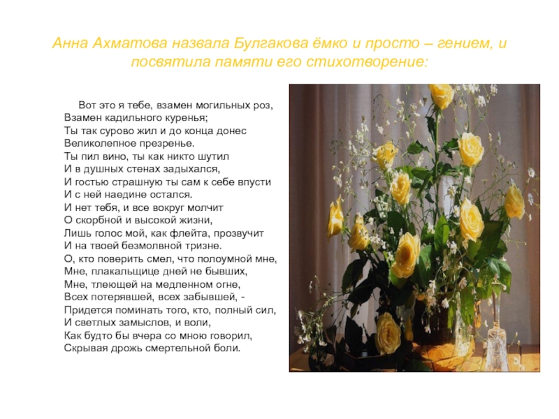 Слайд 10Анна Ахматова назвала Булгакова ёмко и просто – гением, и посвятила