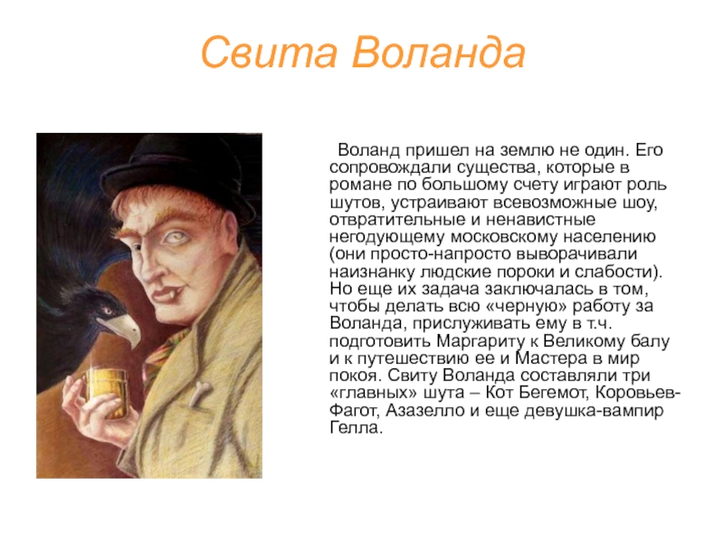 на землю не один. Его сопровождали существа, которые в романе по большому счету играют роль шутов, устраивают всевозможные шоу, отвратительные и ненавистные негодующему московскому населению (они просто-напросто выворачивали наизнанку людские пороки и слабости). Но еще их задача заключалась в том, чтобы делать всю «черную» работу за Воланда, прислуживать ему в т.ч. подготовить Маргариту к Великому балу и к путешествию ее и Мастера в мир покоя. Свиту Воланда составляли три «главных» шута – Кот Бегемот, Коровьев-Фагот, Азазелло и еще девушка-вампир Гелла.