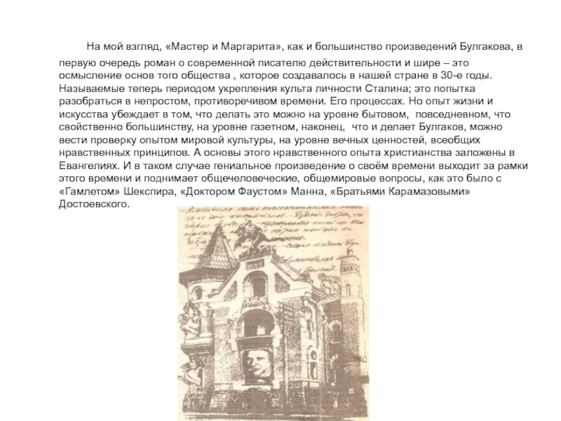 и большинство произведений Булгакова, в первую очередь роман о современной писателю действительности и шире – это осмысление основ того общества , которое создавалось в нашей стране в 30-е годы. Называемые теперь периодом укрепления культа личности Сталина; это попытка разобраться в непростом, противоречивом времени. Его процессах. Но опыт жизни и искусства убеждает в том, что делать это можно на уровне бытовом, повседневном, что свойственно большинству, на уровне газетном, наконец, что и делает Булгаков, можно вести проверку опытом мировой культуры, на уровне вечных ценностей, всеобщих нравственных принципов. А основы этого нравственного опыта христианства заложены в Евангелиях. И в таком случае гениальное произведение о своём времени выходит за рамки этого времени и поднимает общечеловеческие, общемировые вопросы, как это было с «Гамлетом» Шекспира, «Доктором Фаустом» Манна, «Братьями Карамазовыми» Достоевского.