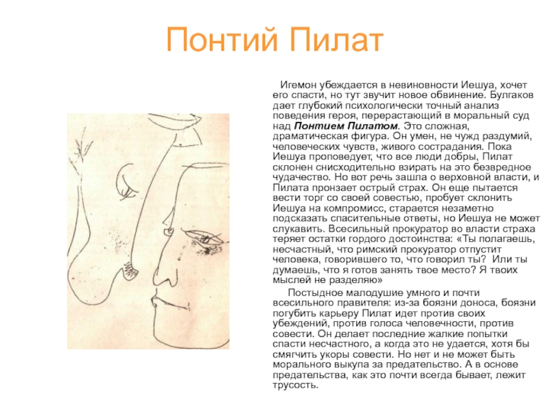 Иешуа, хочет его спасти, но тут звучит новое обвинение. Булгаков дает глубокий психологически точный анализ поведения героя, перерастающий в моральный суд над Понтием Пилатом. Это сложная, драматическая фигура. Он умен, не чужд раздумий, человеческих чувств, живого сострадания. Пока Иешуа проповедует, что все люди добры, Пилат склонен снисходительно взирать на это безвредное чудачество. Но вот речь зашла о верховной власти, и Пилата пронзает острый страх. Он еще пытается вести торг со своей совестью, пробует склонить Иешуа на компромисс, старается незаметно подсказать спасительные ответы, но Иешуа не может слукавить. Всесильный прокуратор во власти страха теряет остатки гордого достоинства: «Ты полагаешь, несчастный, что римский прокуратор отпустит человека, говорившего то, что говорил ты? Или ты думаешь, что я готов занять твое место? Я твоих мыслей не разделяю»