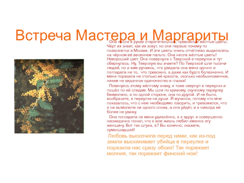 руках отвратительные, тревожные жёлтые цветы. Чёрт их знает, как их зовут, но они первые почему-то появляются в Москве. И эти цветы очень отчётливо выделялись на чёрном её весеннем пальто. Она несла жёлтые цветы! Нехороший цвет. Она повернула с Тверской в переулок и тут обернулась. Ну, Тверскую вы знаете? По Тверской шли тысячи людей, но я вам ручаюсь, что увидела она меня одного и поглядела не то, что тревожно, а даже как будто болезненно. И меня поразила не столько её красота, сколько необыкновенное, никем не виданное одиночество в глазах!