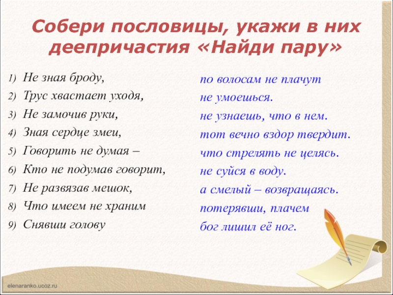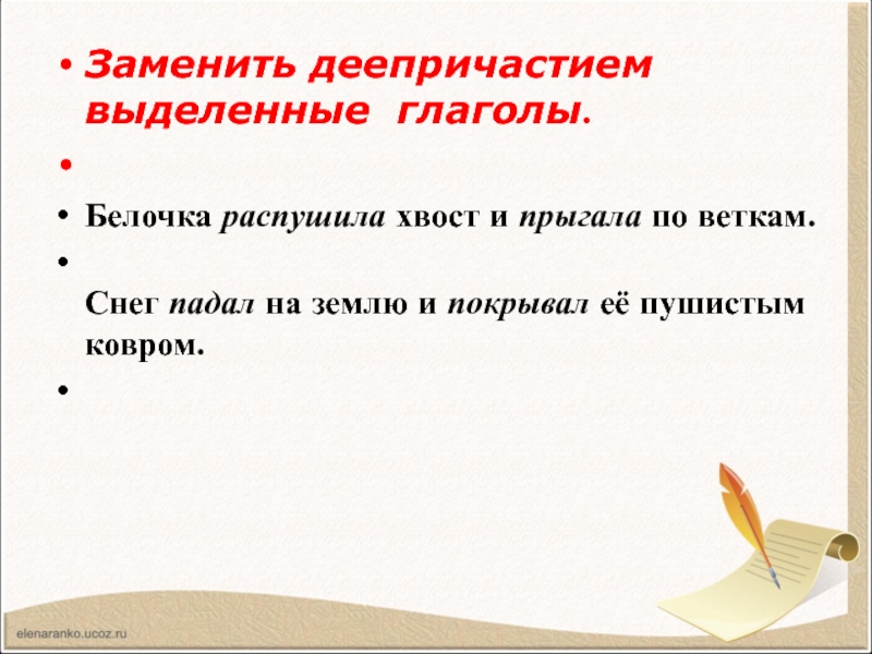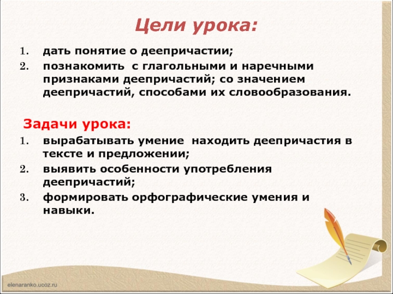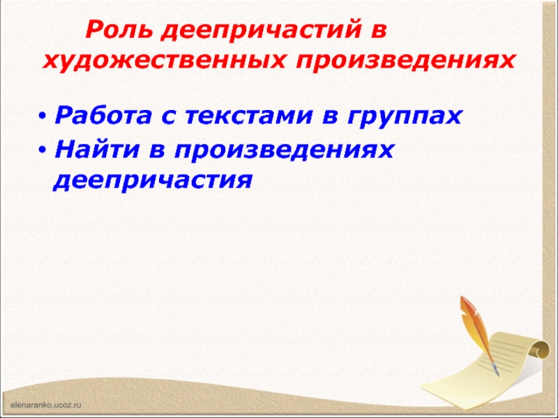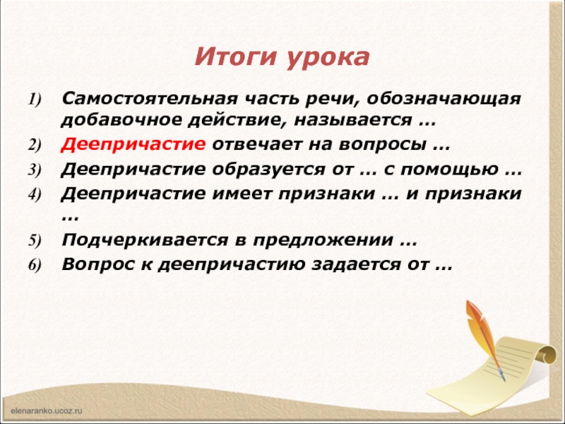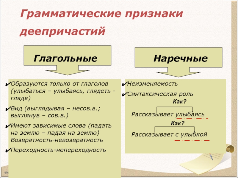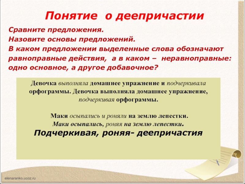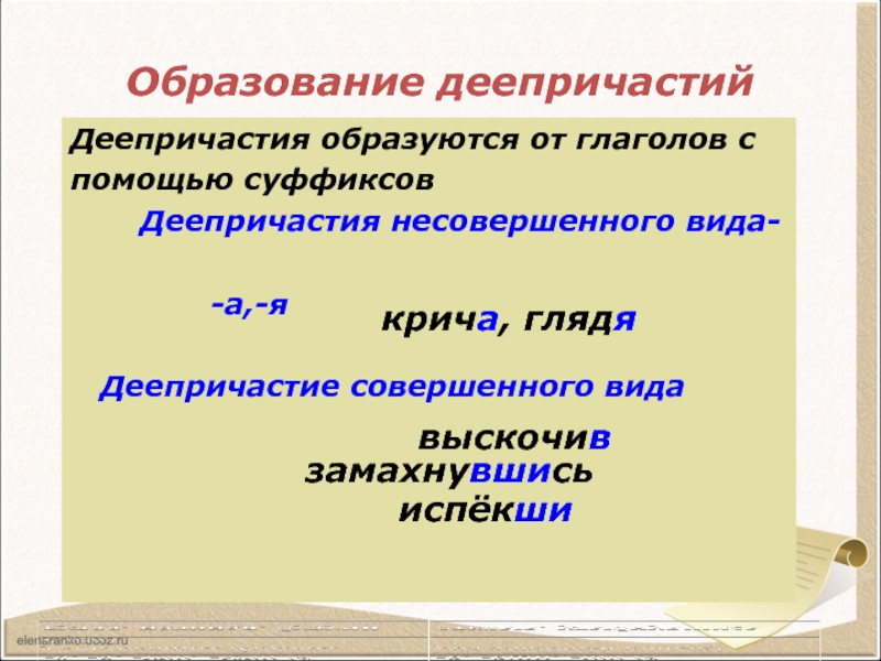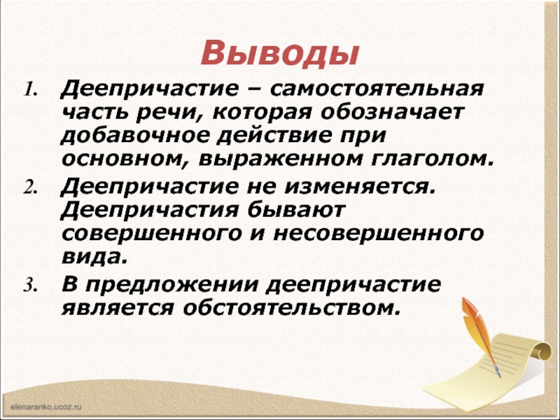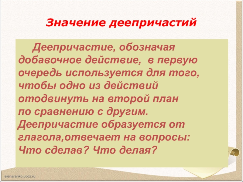 Деепричастие, обозначая добавочное действие, в первую очередь используется для того, чтобы одно из действий отодвинуть на второй план по сравнению с другим. Деепричастие образуется от глагола,отвечает на вопросы: Что сделав? Что делая?