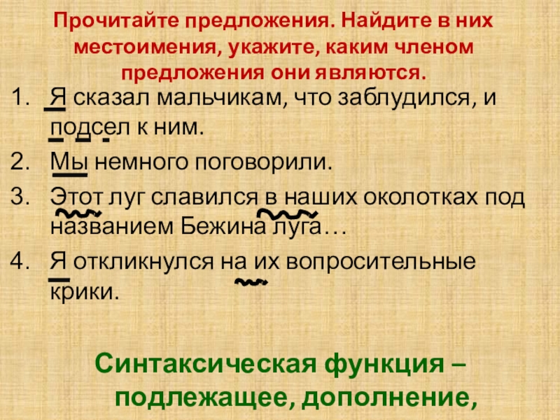 Синтаксическая функция – подлежащее, дополнение, определение.