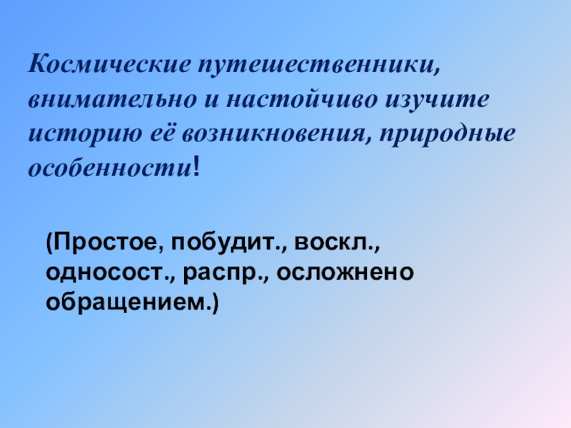 (Простое, побудит., воскл., односост., распр., осложнено обращением.)