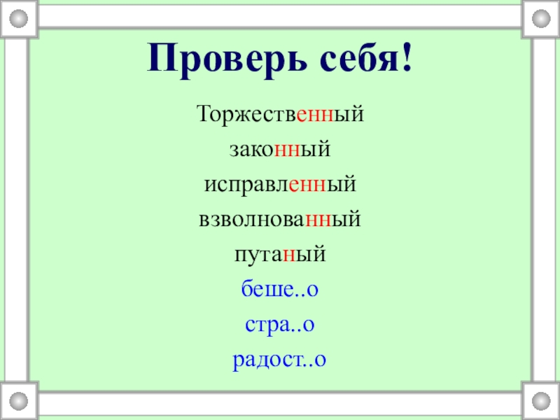 Проверь себя!Торжественный законный исправленный взволнованный путаный беше..о стра..о радост..о