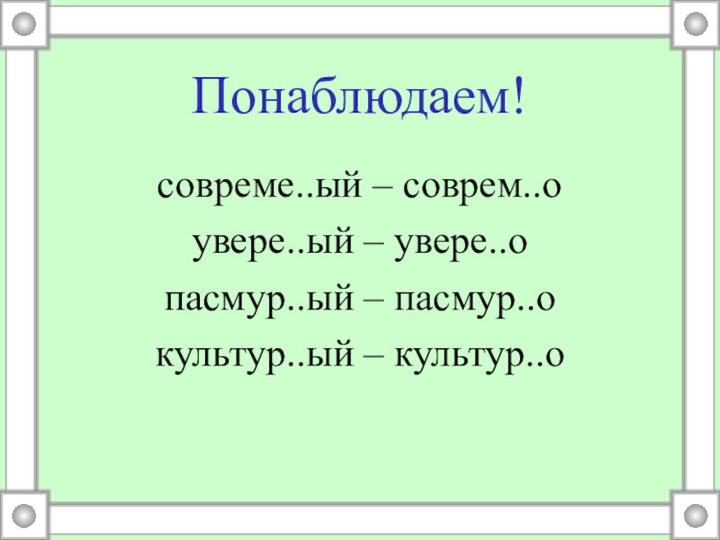 Понаблюдаем!совреме..ый – соврем..оувере..ый – увере..опасмур..ый – пасмур..окультур..ый – культур..о
