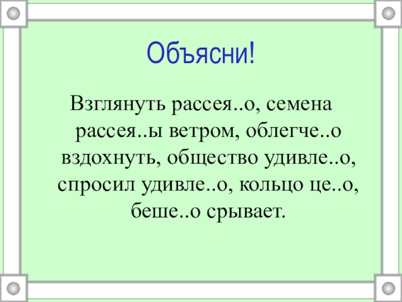 Объясни!Взглянуть рассея..о, семена рассея..ы ветром, облегче..о вздохнуть, общество удивле..о, спросил удивле..о, кольцо це..о, беше..о срывает.