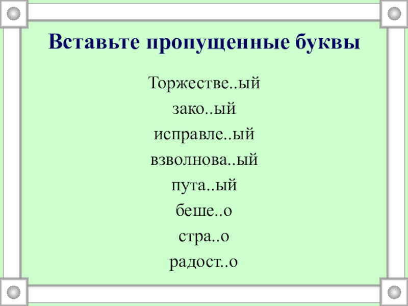 Вставьте пропущенные буквыТоржестве..ый зако..ый исправле..ый взволнова..ый пута..ыйбеше..о стра..о радост..о