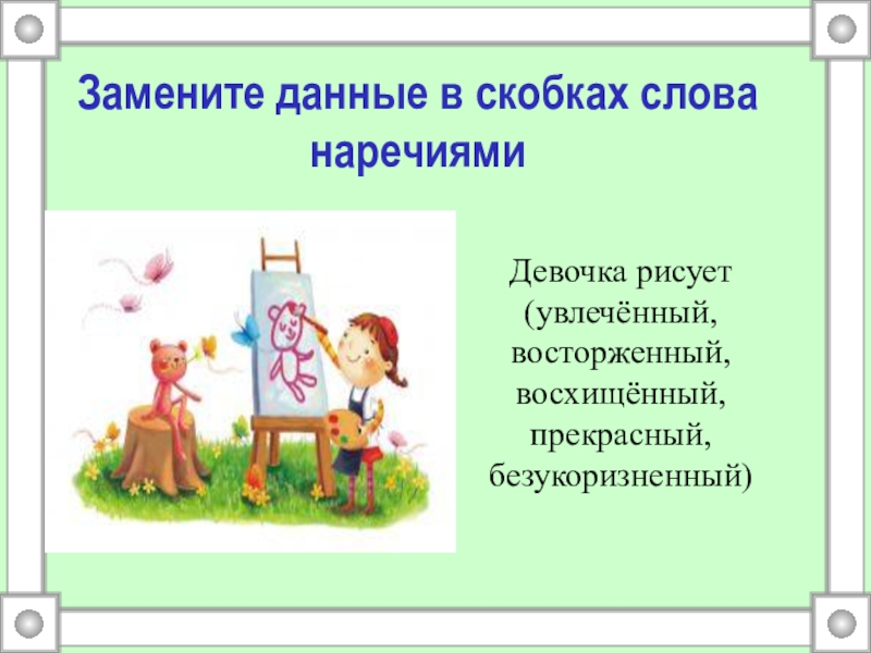 Замените данные в скобках слова наречиямиДевочка рисует (увлечённый, восторженный, восхищённый, прекрасный, безукоризненный)