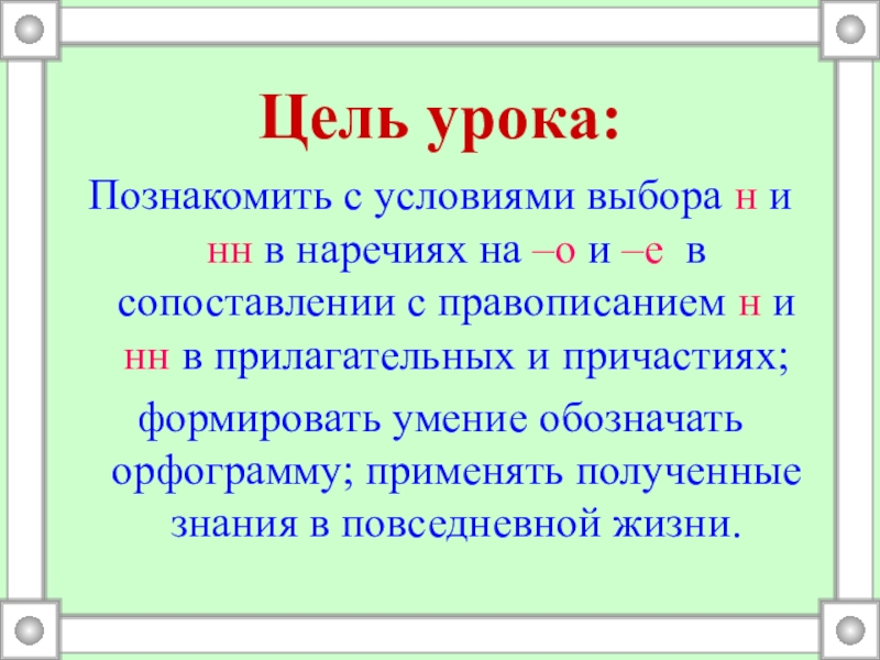 Цель урока:Познакомить с условиями выбора н и нн в наречиях на –о и –е в сопоставлении с