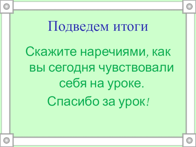Подведем итогиСкажите наречиями, как вы сегодня чувствовали себя на уроке.Спасибо за урок!