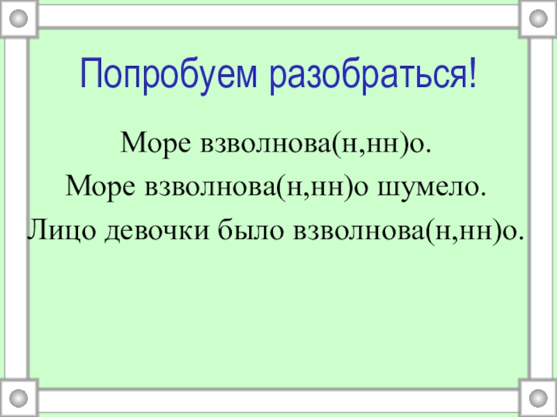 Попробуем разобраться!Море взволнова(н,нн)о.Море взволнова(н,нн)о шумело.Лицо девочки было взволнова(н,нн)о.