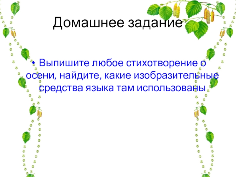 Домашнее заданиеВыпишите любое стихотворение о осени, найдите, какие изобразительные средства языка там использованы